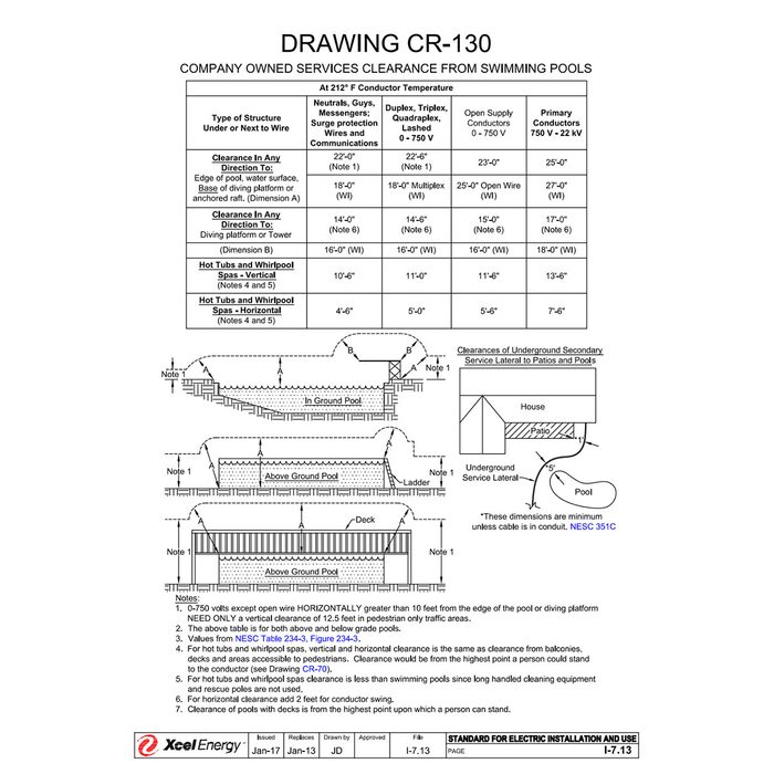 - When located near a swimming pool, overhead service conductors must be at least 10 feet away from the pool horizontally and at least 22 1/2 feet high.