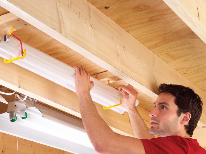 Safely store extra fluorescent bulbs in jumbo-sized vinyl-clad storage hooks in a handy location near your fixture in the shop, garage or basement. Cut the hooks off one end of a couple of mini bungee cords and use zip ties to attach the severed ends to the top of two vinyl-clad steel storage hooks. Store several fresh bulbs and mark your bad bulbs with a marker and store them until it’s time to recycle.