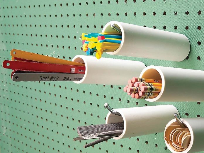 Faithful reader Raymond Hudon sent us a tool storage technique for all those slender tools and shop accessories. Cut short lengths of PVC pipe (1-1/2- and 2-in.-diameter pipes work well for most items) and slide them over pegboard hooks. Then load them up with files, hacksaw blades, zip ties, pencils, stir sticks . . . you get the skinny.