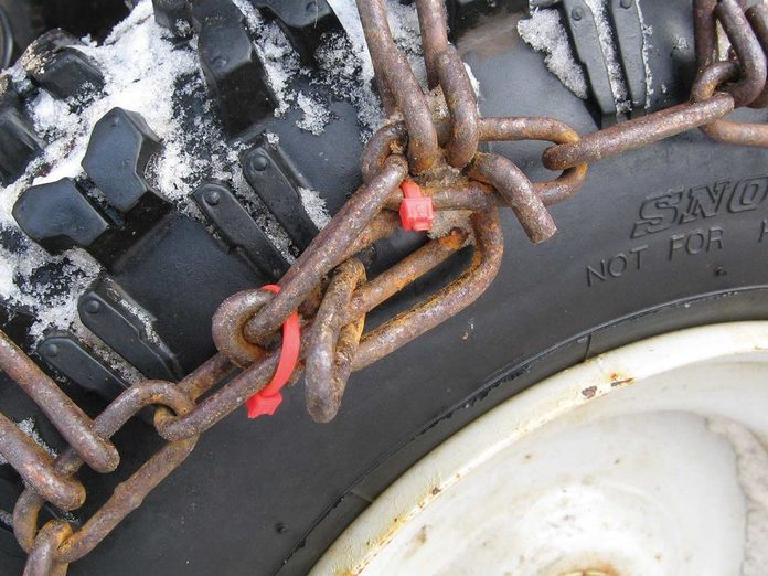 Snowblower chains pop off when you least expect it. Here’s a simple solution that will prevent the chain from unhooking and coming loose. Tie the locking links in place with nylon zip ties. The chains will stay secure until you decide it’s time to take them off.