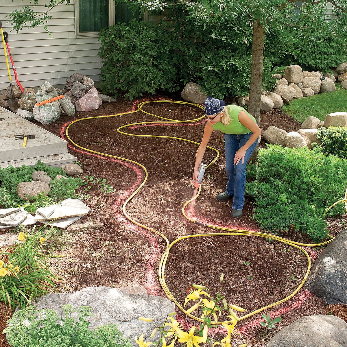 - Outline the location of your stream with a garden hose, then paint a line around it. Use paint to mark waterfall locations and ideal spots for large decorative boulders.