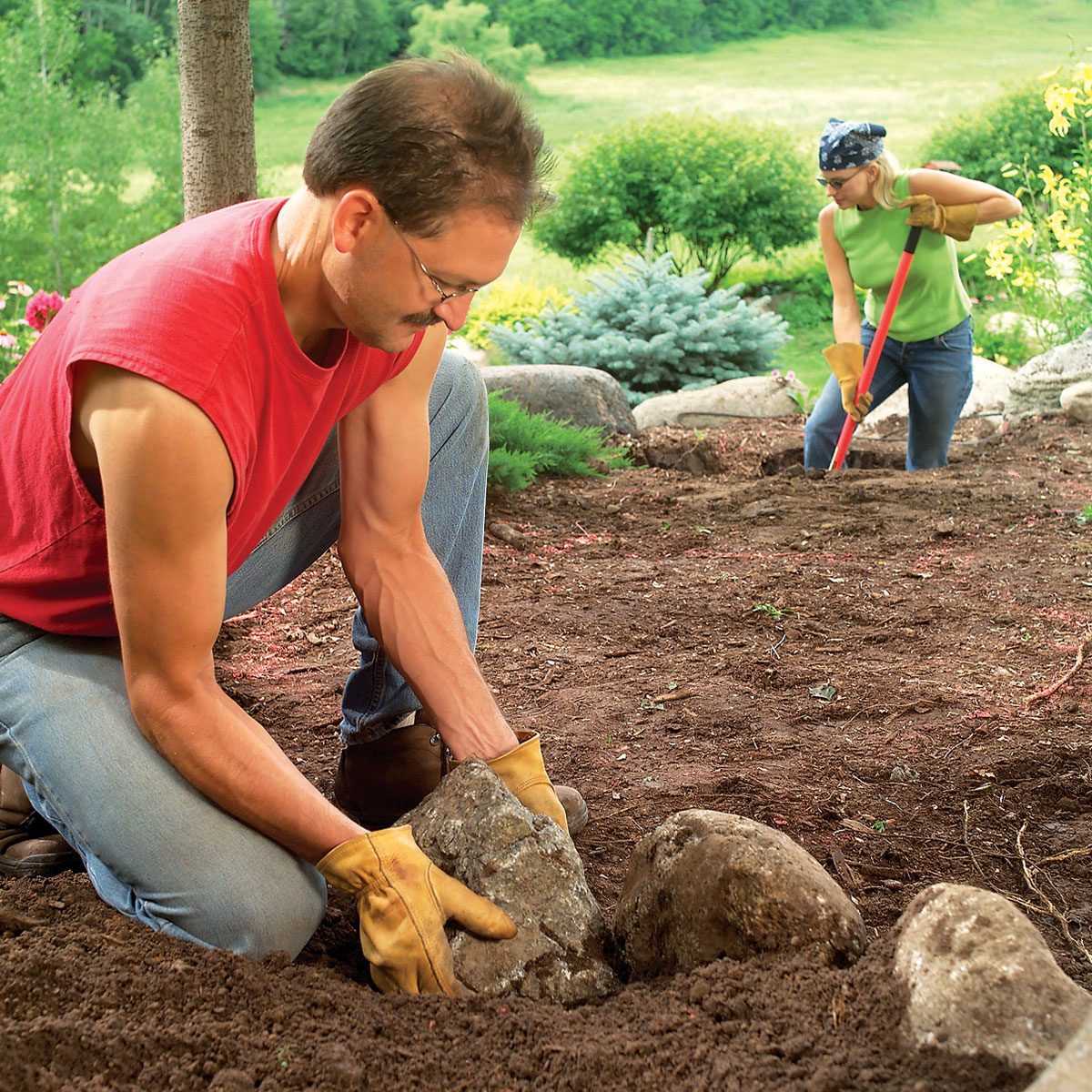 - Pro tip: Use a rubber mallet to pack dirt and gravel tightly around the stones to hold them in place.