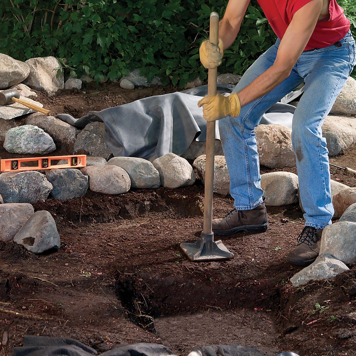 - Lay the fabric underlayment and rubber liner in the basin hole, then add the pump basin with pump.