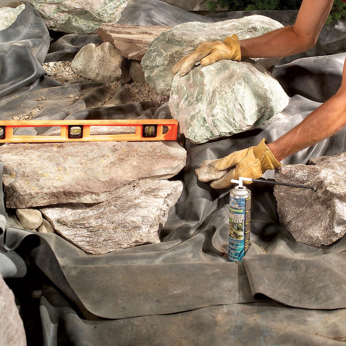 - Apply black expanding foam sealant, designed for ponds and waterfalls, to the underside to adhere them to the rubber liner.