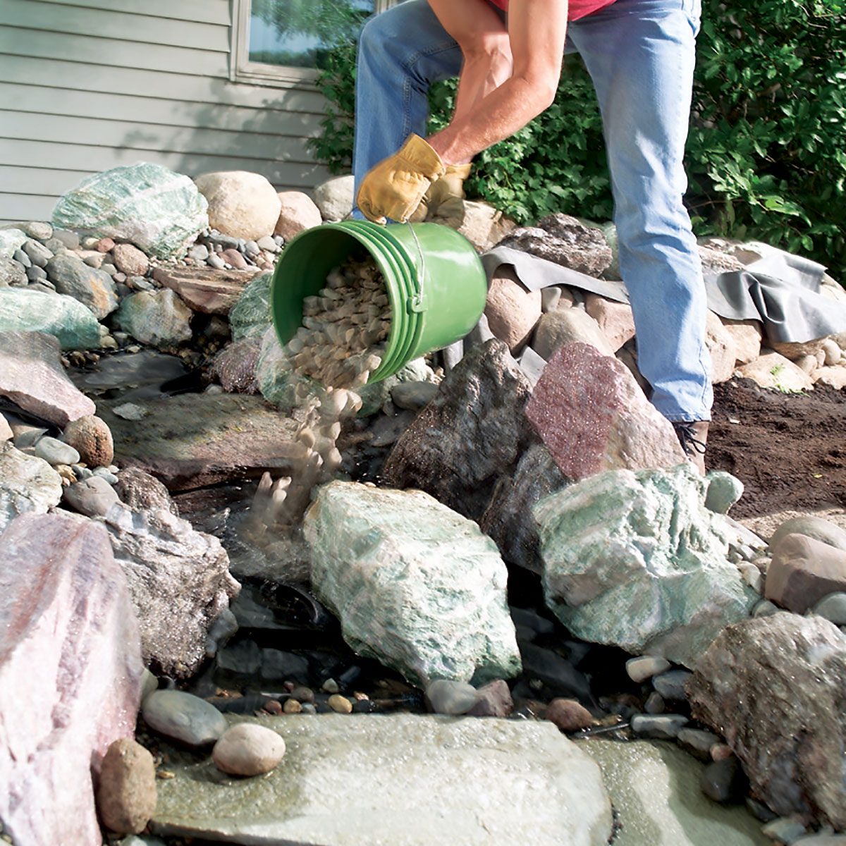 - Pro tip: For stable, above-ground stream edges, backfill the edging stones with a gravel and dirt mixture and compact it.