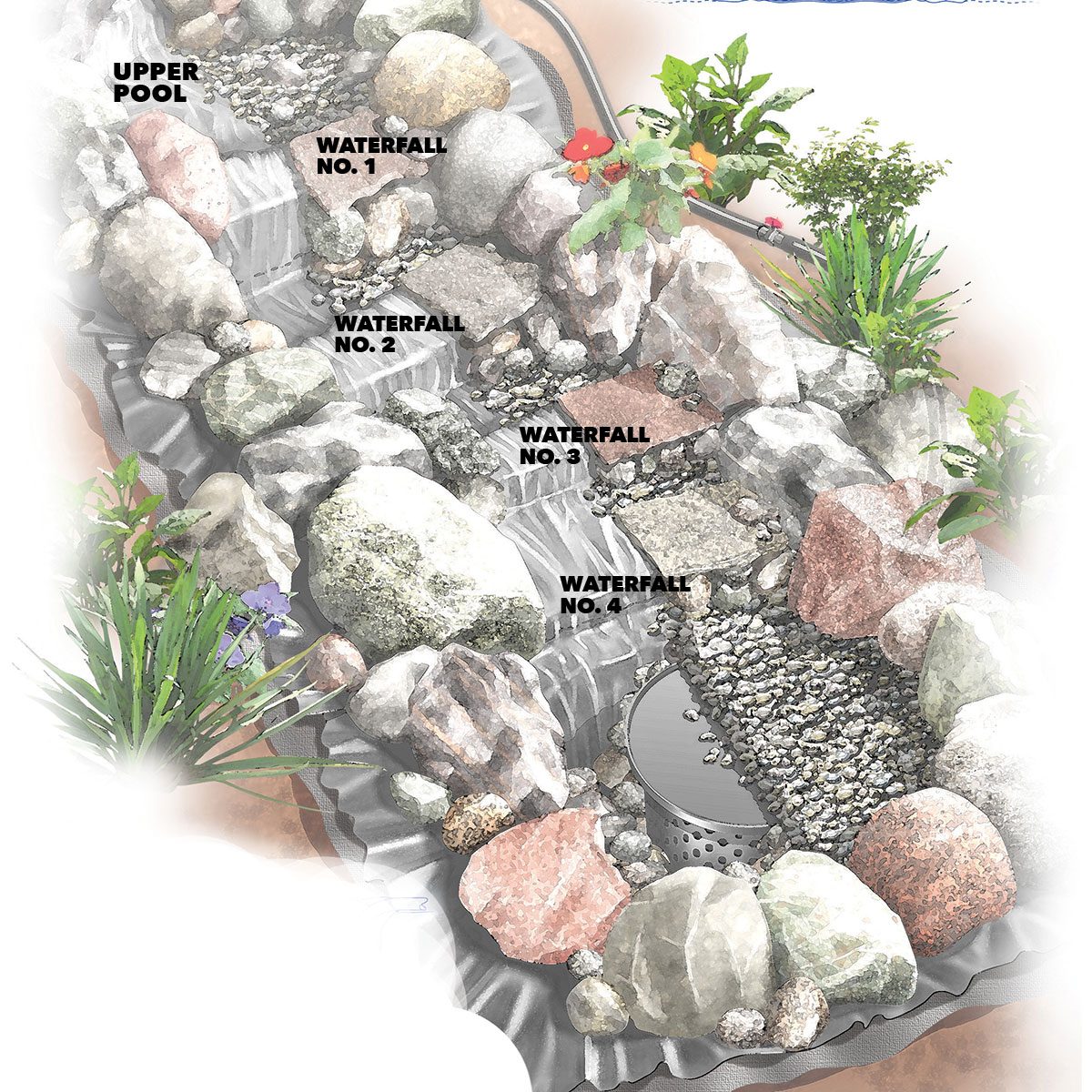 Use these illustrations to help you plan your water feature and learn how to build a pond-less waterfall.