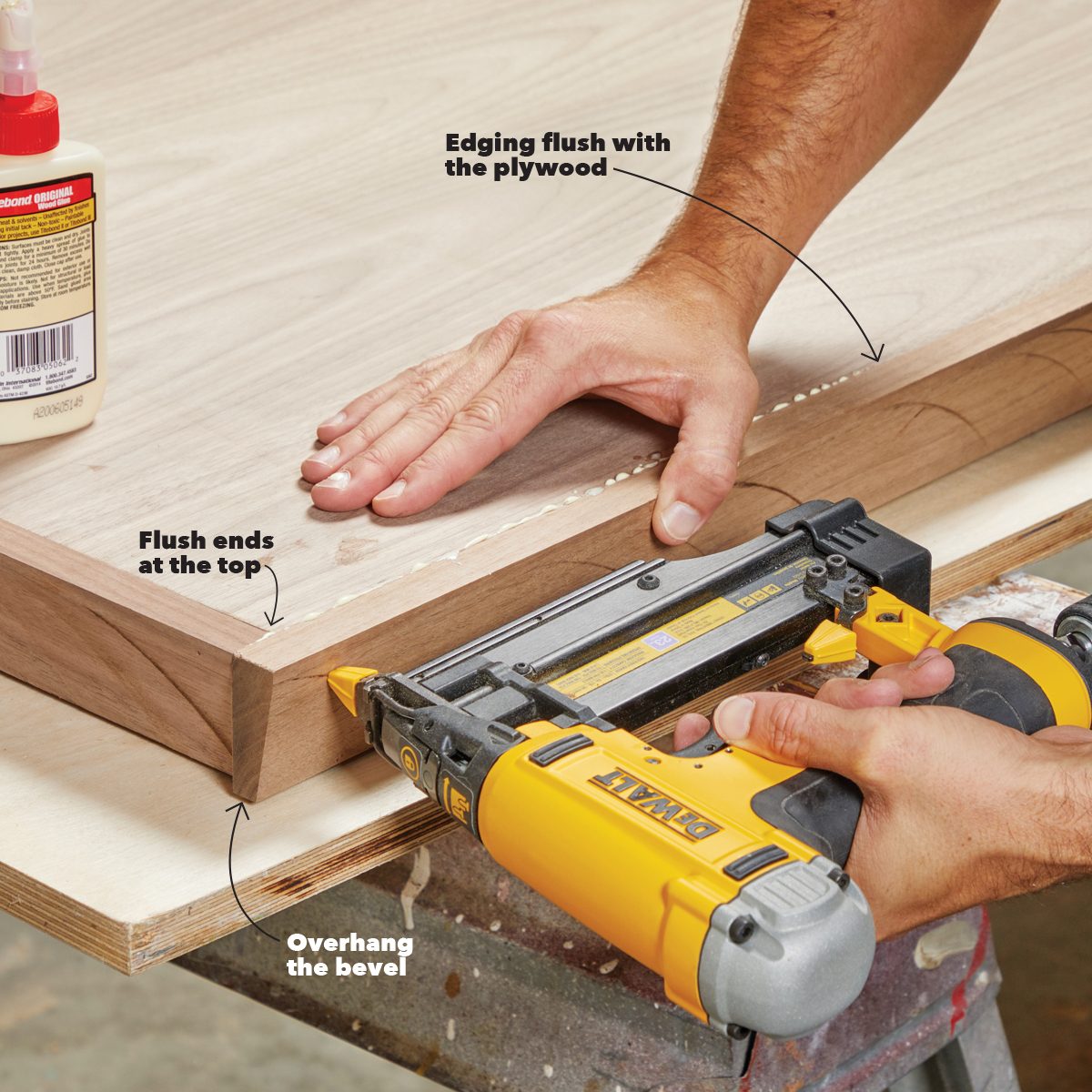 - Pro tip: Instead of fumbling with long clamps, I used a pin nailer to hold the edging in place while the glue dried.