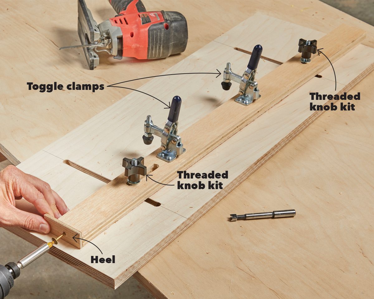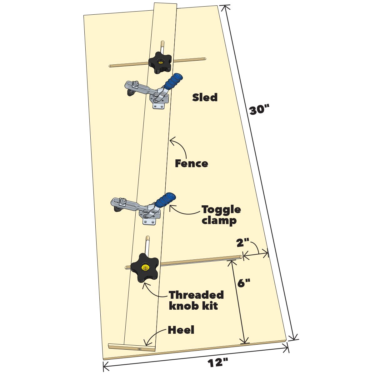 - Connect the fence to the sled with a pair of threaded jig knob and 1/4-in. bolts
