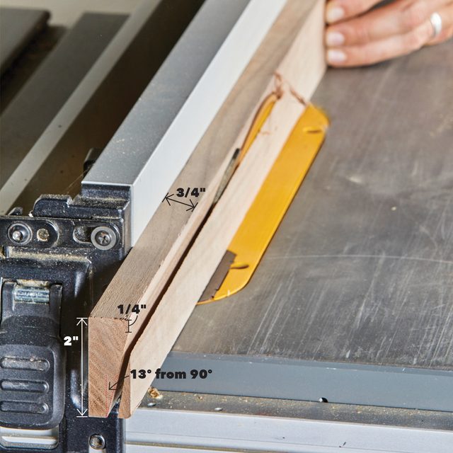- The top is wrapped with edging to hide the plywood edges. Square edging would be fine, but I cut a 13-degree bevel on the edging stock. This bevel matches the angle of the legs and gives the table a more refined look.