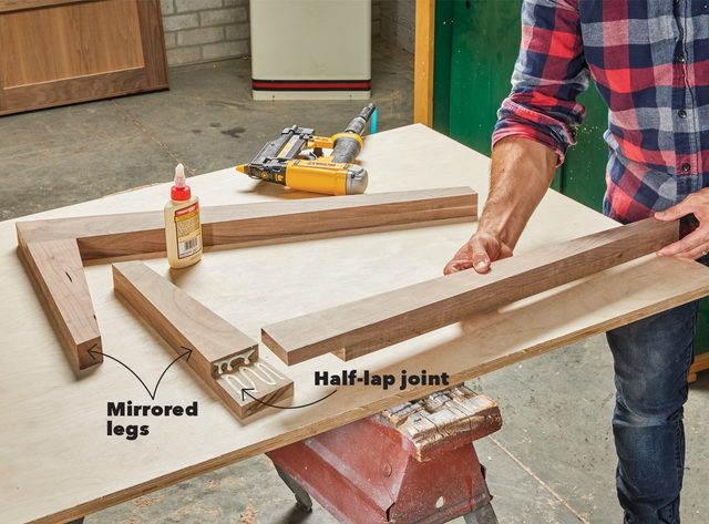 - Since the legs will be swung in and out, I decided to build a half-lap joint instead of a miter, which would have to be reinforced. It also made assembling the legs much easier.