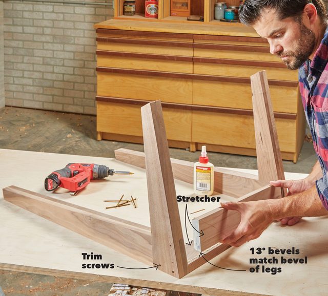 - Cut another 13-degree bevel in the stretcher then glue and screw it between a pair of legs.