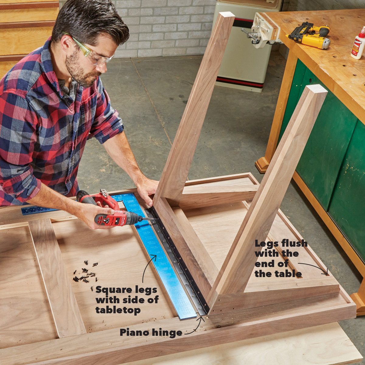 - Position the legs with a framing square, then pre-drill and screw a length of piano hinge to the tabletop and the legs.