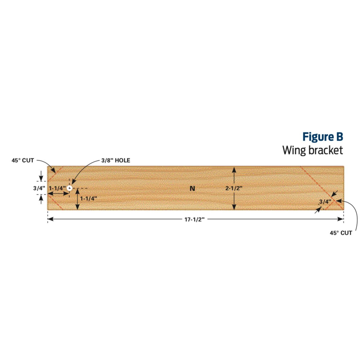 Secure the ‘wing frames’ to the cabinet using 24-in. piano hinges (Photo 6). Set the wing frames on the cabinet while installing the hinges to give you the right hinge position (you want the hinge knuckle flush with, or slightly above, the top of the plywood). Cut the wing brackets (N) and rungs (P), then nail them into a U-shape. Drill 3/8-in. holes through the wing brackets and 5/16-in. holes in the sides of the wing frames as shown in Figure A, then connect them with 2-in. bolts (Photo 7). Install the wing panels (H) using glue and screws.