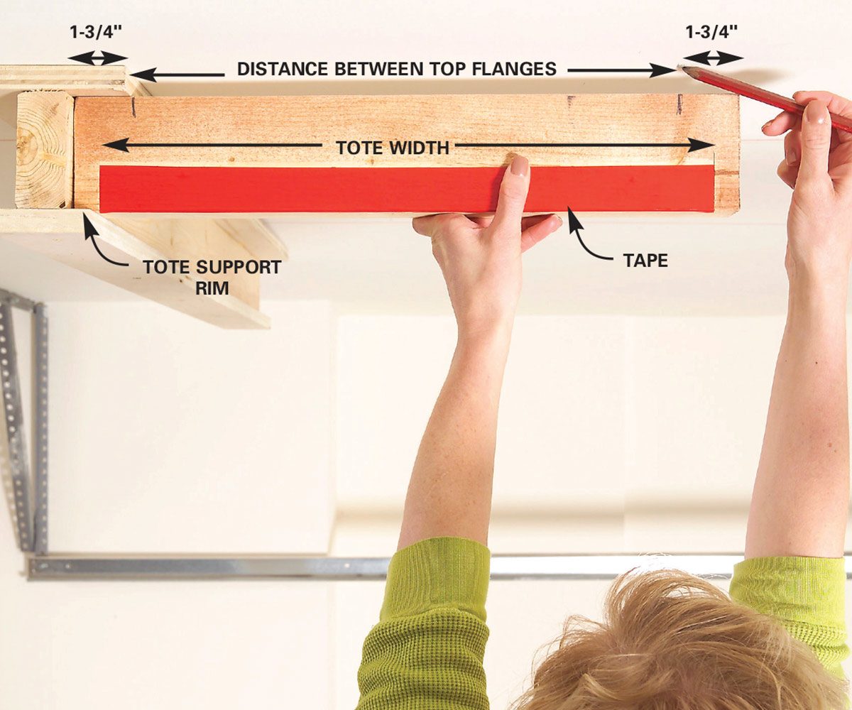 Measure the top of the tote to determine the width of the tote rims (3/4-inch) and the size of the bottom flanges of the carriages (in our case, three inches).