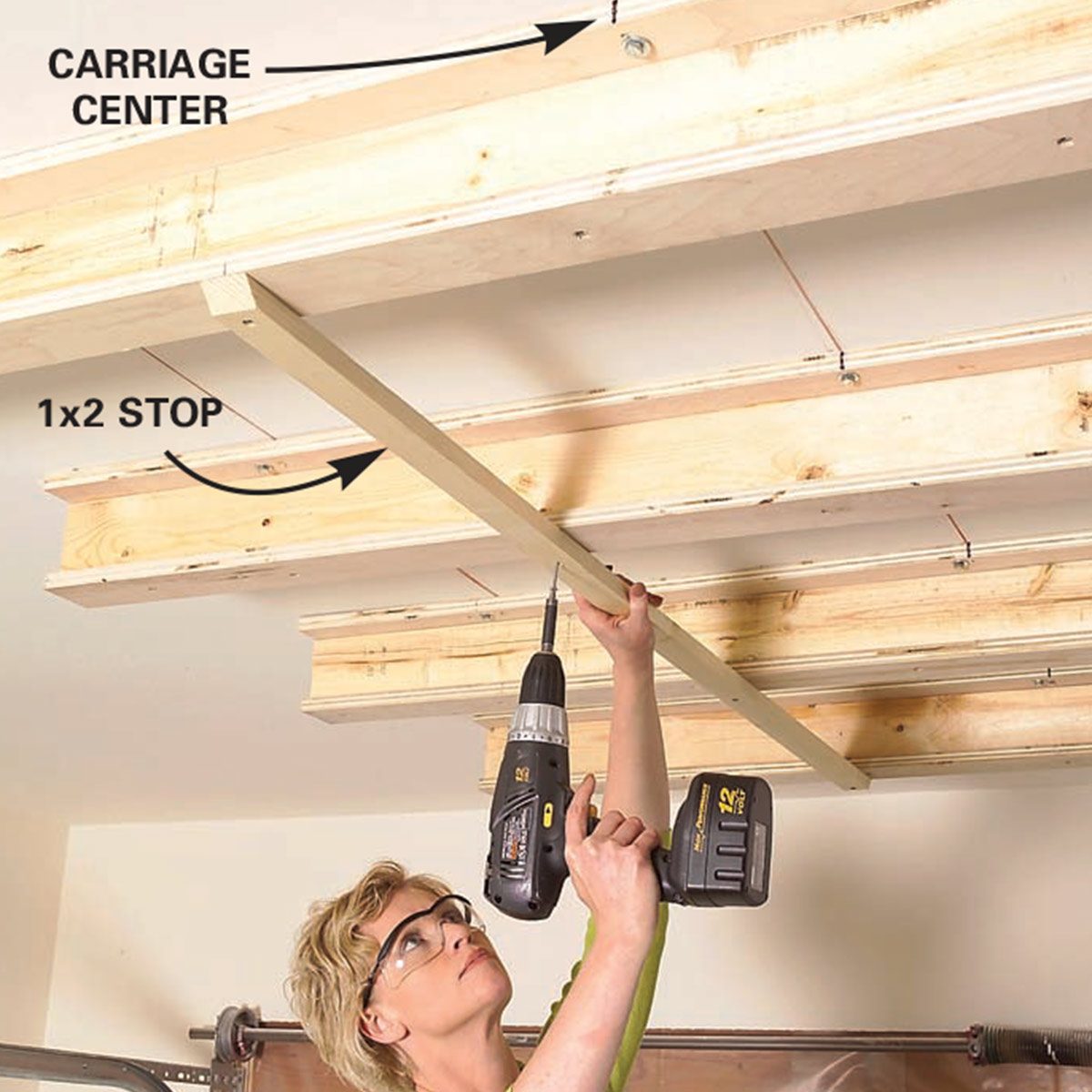In this article, we’ll show you how to assemble these simple carriages, align them perpendicular to the ceiling joists, then anchor them into place with lag screws. It’s that easy. Add labels to the sides of the totes and you can tell at a glance where to find that long-term storage item. The carriages are quick and easy to assemble. They can be constructed, installed, and you can begin to organize your garage the very same day!