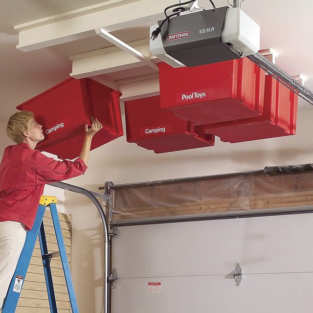 If you don’t have unused space above the garage door, you can install this ceiling garage storage system just about anywhere. However, keep the totes at least two feet from garage lighting, door springs and garage door openers.