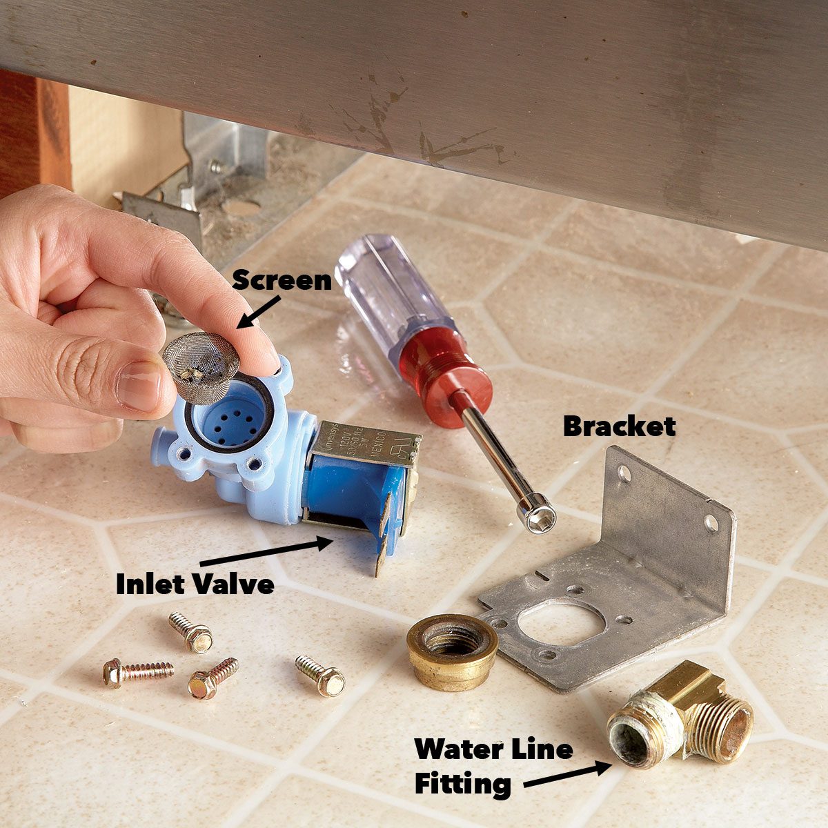 - Unscrew the water line fitting from the valve. Then unscrew the four screws that connect the valve to the bracket.