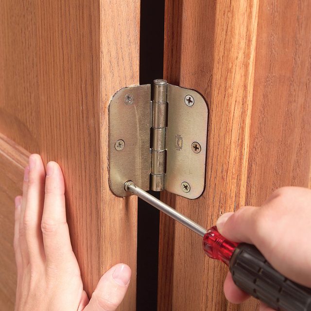 Tighten the hinge screws in the door and the jamb. Snug them firmly with a screwdriver rather than a drill to avoid stripping the screw holes.