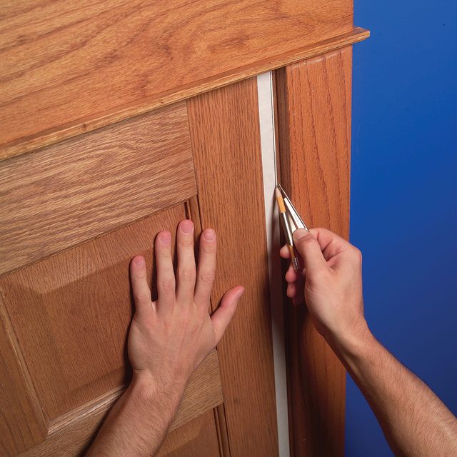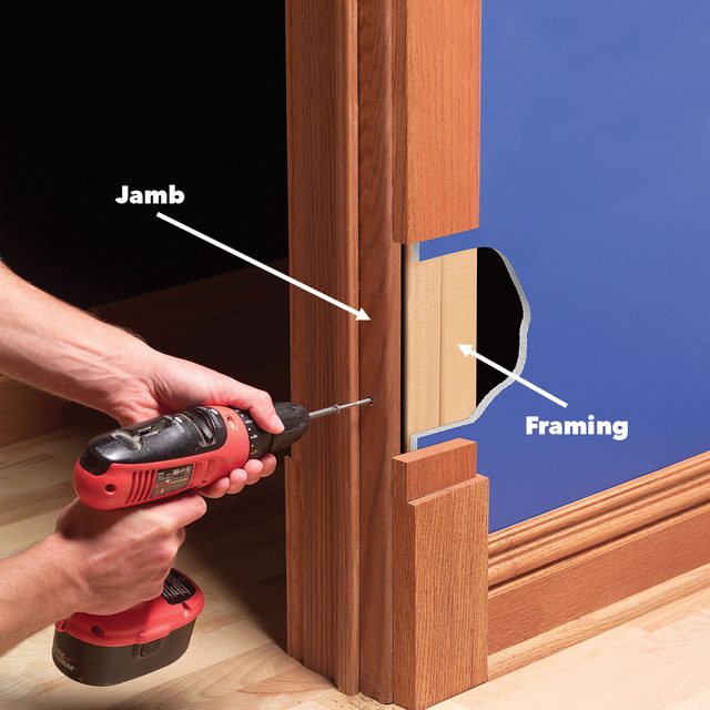 This is really just another version of the hinge adjustment described above. By driving a long screw through the “latch” side of the jamb (rather than the hinge side), you can often draw in the jamb and give the door a little extra space. Try this only if drawing in the hinges doesn’t work; it leaves you with a large screwhead hole to cover.