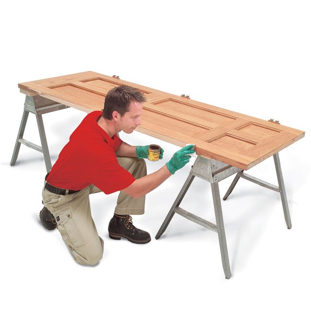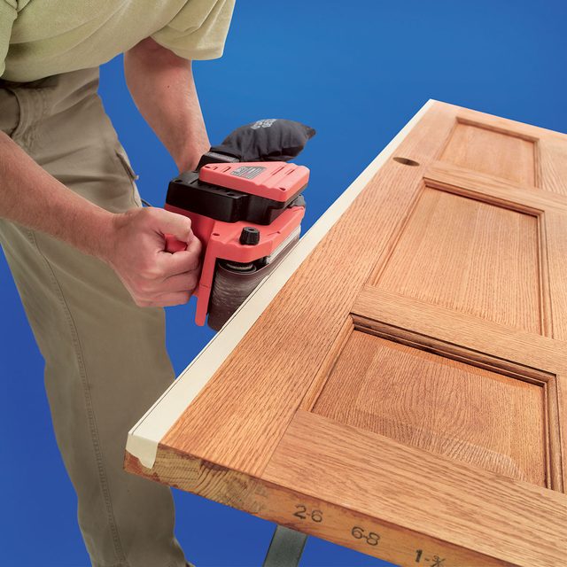 Stain or paint the sanded edge. When varnishing the edge, apply polyurethane with a lint-free rag rather than a brush to avoid slopping onto the door’s face.