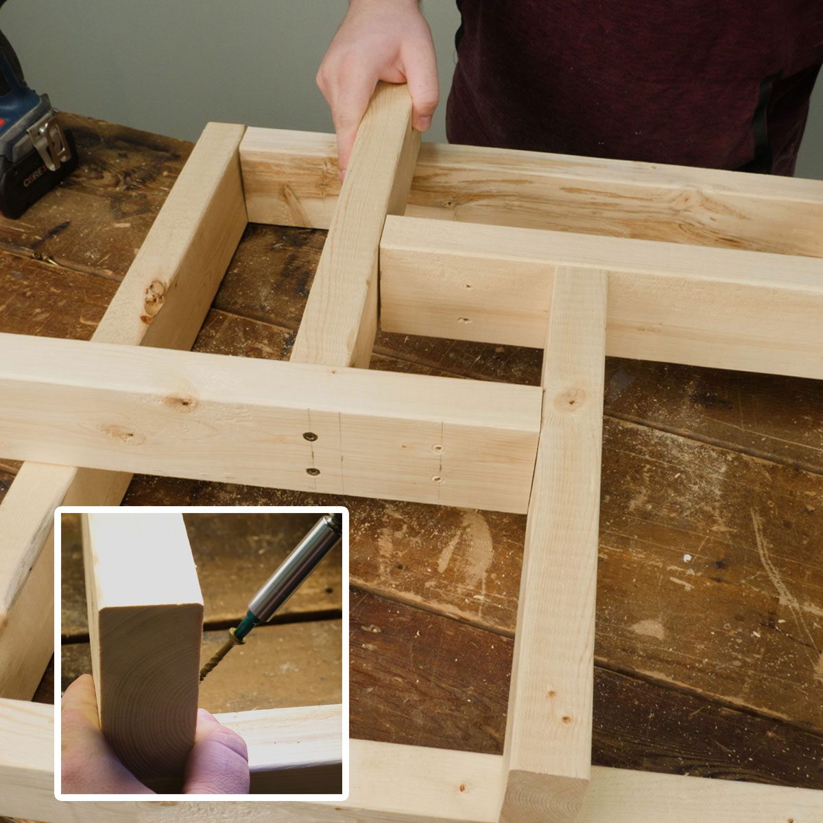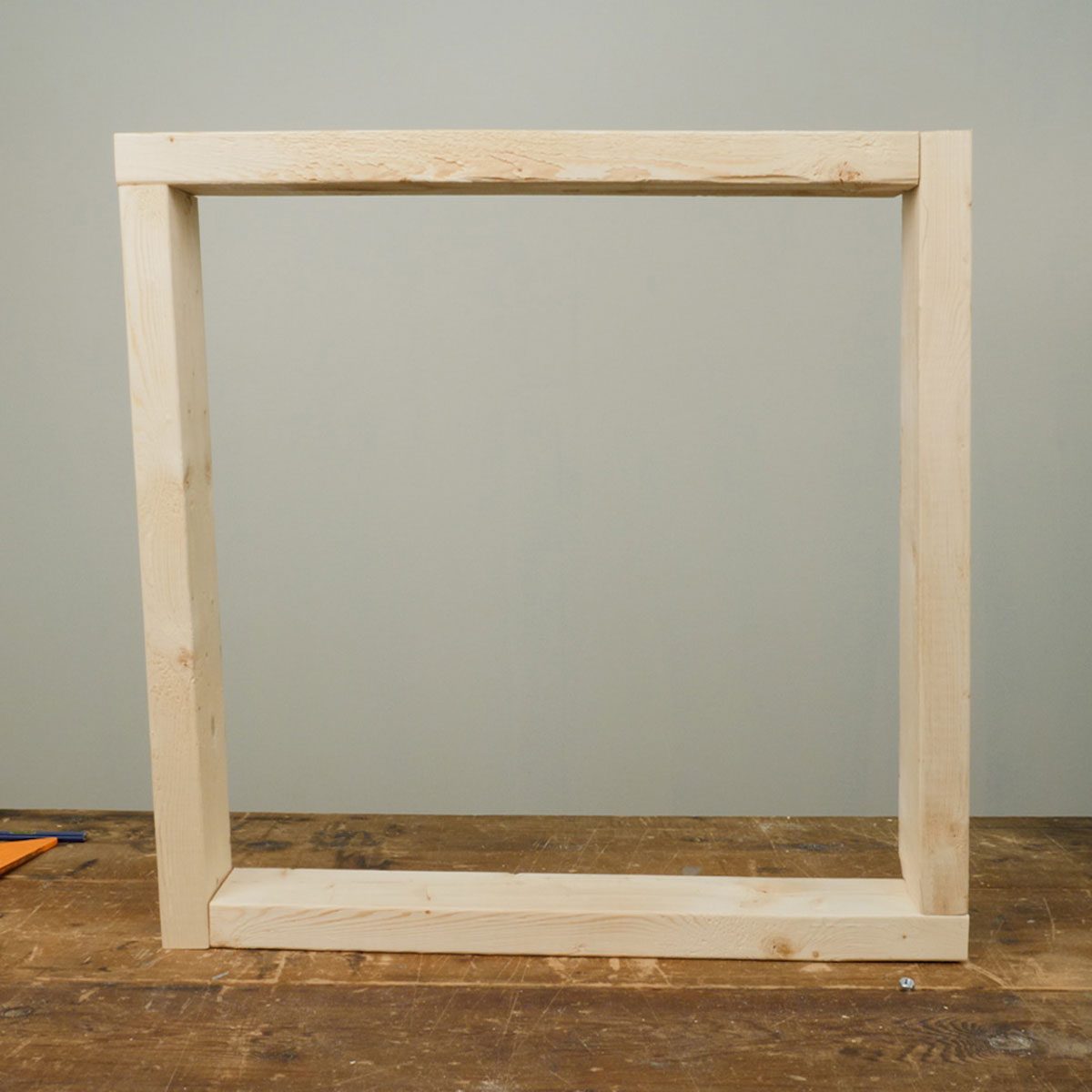 - Build a square out of those four sections of 2×4, butting the ends together in a spiraling pattern so you end up with a square, 25-in. x 25-in. base.