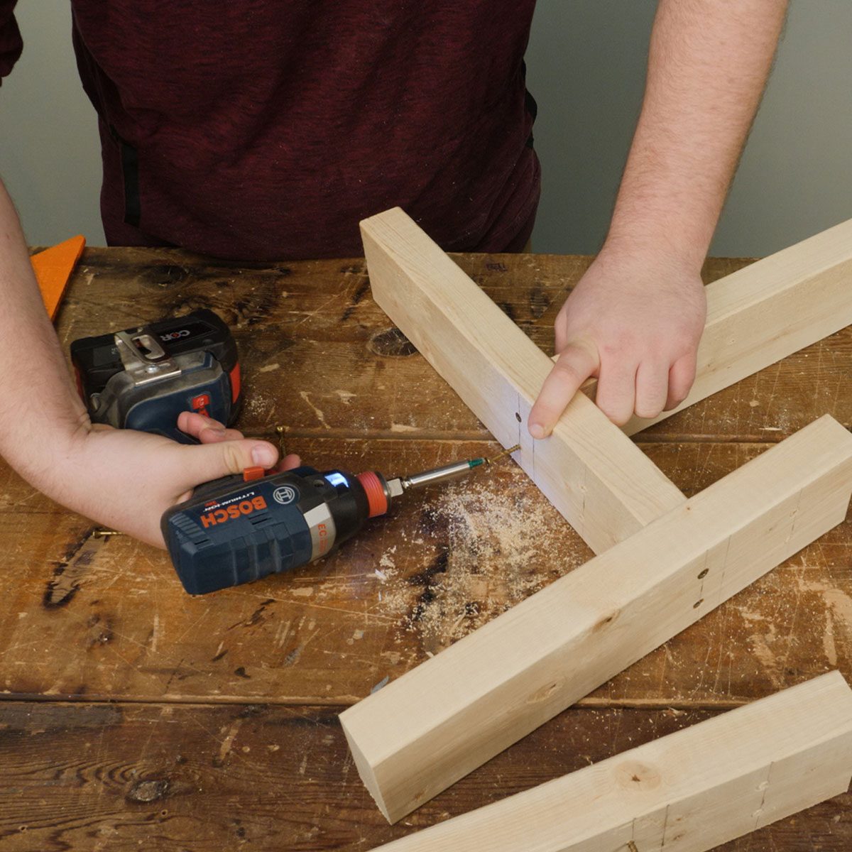 - Pro Tip: You could also nail the base together, but it’s best to use screws so there’s no risk of it coming apart later and your fully-decorated Christmas tree toppling over.