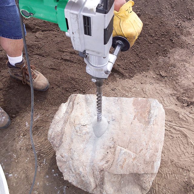 • Pro Tip: Don’t force the drill; let the weight of the hammer drill do the work. Pull the bit out of the stone every inch or so to clear the dust. If you’ve picked out a rounded stone, stabilize it before drilling by digging a little crater in the ground to rest it in.