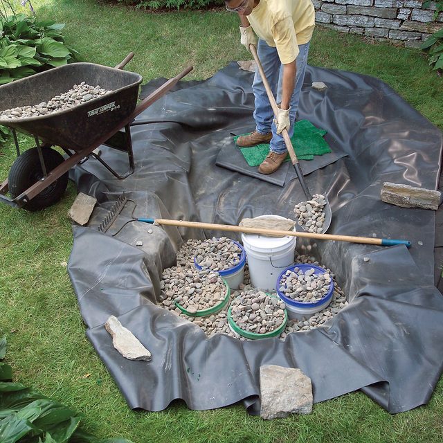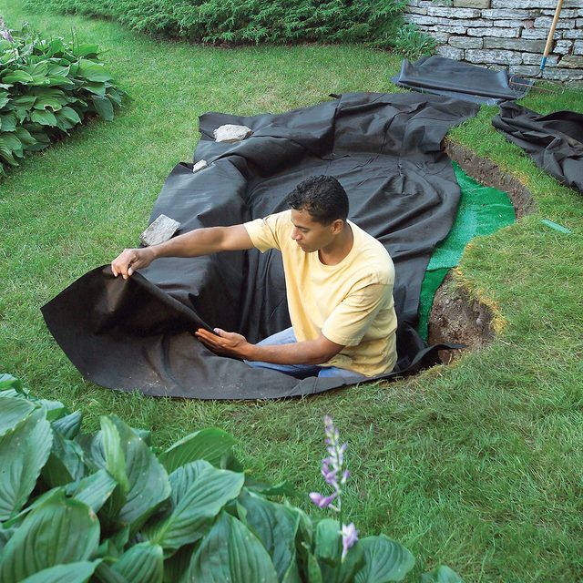 • Pro Tip: The whole purpose of the pond liner padding is to protect the waterproof liner from punctures, but it won’t offer complete protection. Cut off roots flush with the bottom and sides of the hole and dig out sharp stones.