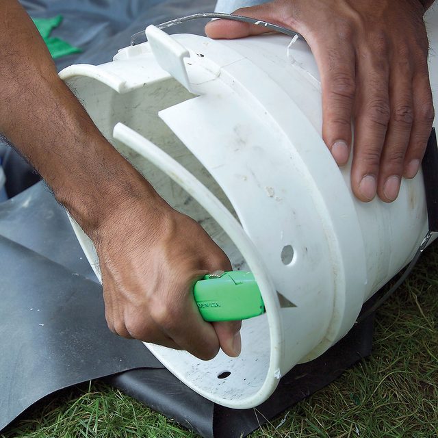 • Cut off the rim from the pump pail and cut and fold down a 1-1/2-in.-wide x 2-in. flap at the top for the water line and electrical cable