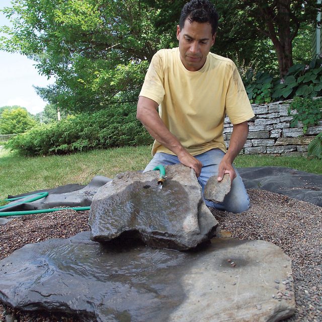 • Place and roughly adjust the fountain boulders using a garden hose placed near the fountain hole to simulate the water’s path. Then flip over the boulder to access the underside of the hole.
