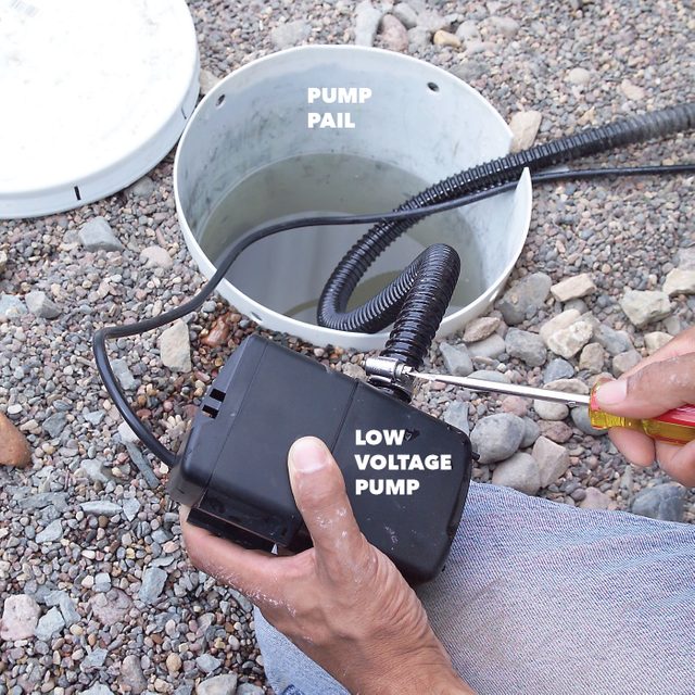 • We selected a low-voltage pump because it’s safer and the wiring is easier to install. You only need to bury the cable an inch or two below grade. For a standard 120-volt pump, however, you’ll have to apply for an electrical permit, bury the wire much deeper and install a GFCI protected outlet.