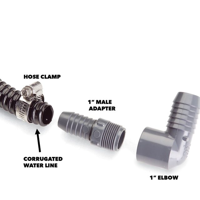 • Use a hose clamp to attach the adapter to the water line. Then screw the elbow to the adapter.