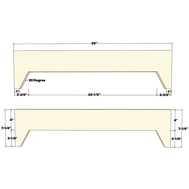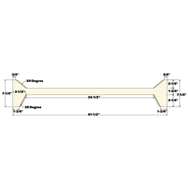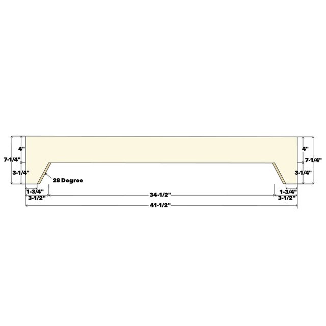 - Connect the one-inch lines with the 3-1/4-in line at a 28 degree angle using an adjustable square, or make a 28 degree template with your miter saw (see photo).