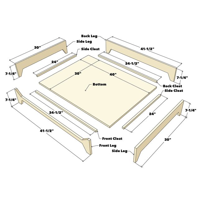 - Cut two cleats at 34-1/2-in. and two side cleats at 24 inches.