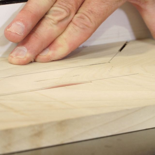 - To cut the two horizontal lines, make a plunge cut using a circular saw with a straight edge, or a table saw. Be sure to stop before the angle cuts.