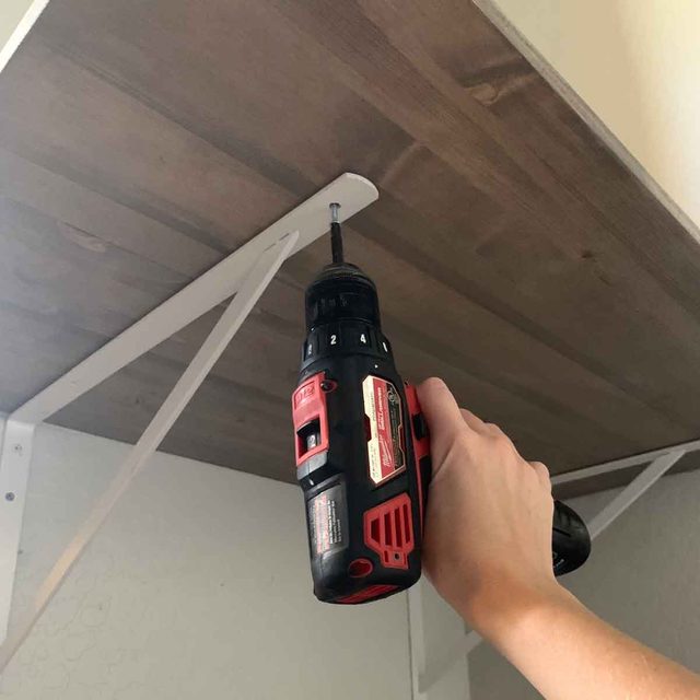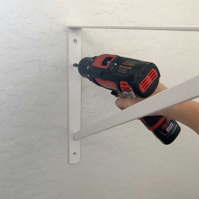- Pro tip: Hold the board against the brackets firmly as you drill to ensure it does not move out of place. You want the desk to be solid and sturdy enough to hold the kids’ backpacks.Â