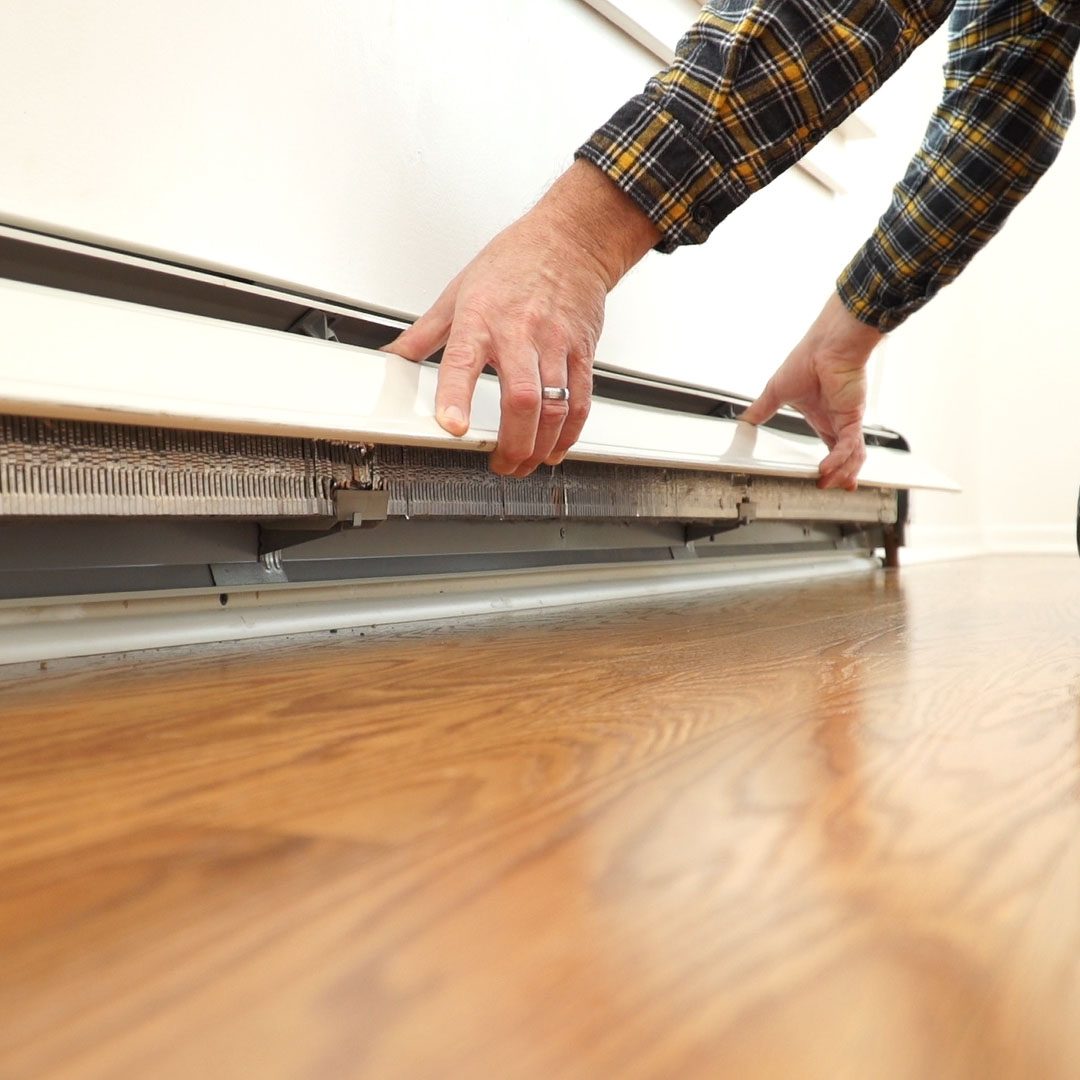 • Remove the front cover of the baseboard heater by lifting it up from the bottom and pulling it out toward you (see photo). Sometimes, the edges of the covers may be a little sharp. It doesn’t hurt to grab a good pair of work gloves to make sure you don’t get cut.