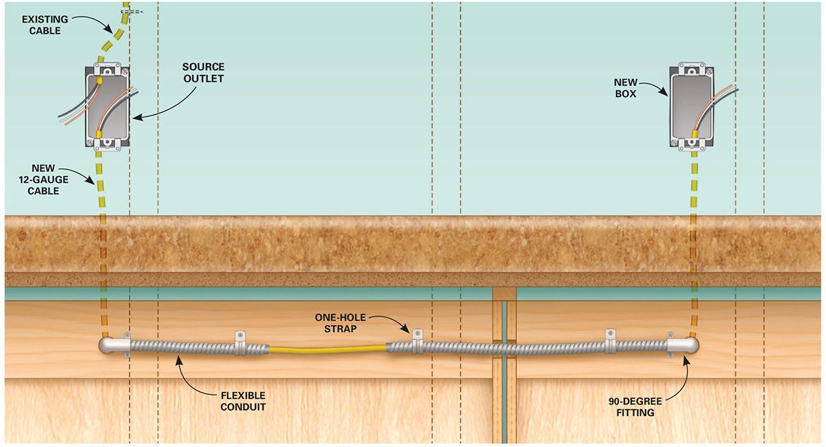 Not that long ago, the average kitchen counter was home to a toaster, coffeemaker and maybe a blender, but things have changed. It's getting harder to find an available outlet to plug everything in. Extension cords and power strips are unsightly and dangerous. The only real solution is to add more outlets. To help, we tracked down an electrician who, not surprisingly, adds kitchen outlets all the time. He showed us how he adds an outlet to a kitchen backsplash by running conduit through the back of the cabinets. This method is fast, inexpensive, super simple, and best of all, doesn’t require a whole bunch of wall repairs or painting. This article shows how to install one new outlet, but you can add several by following similar steps.
