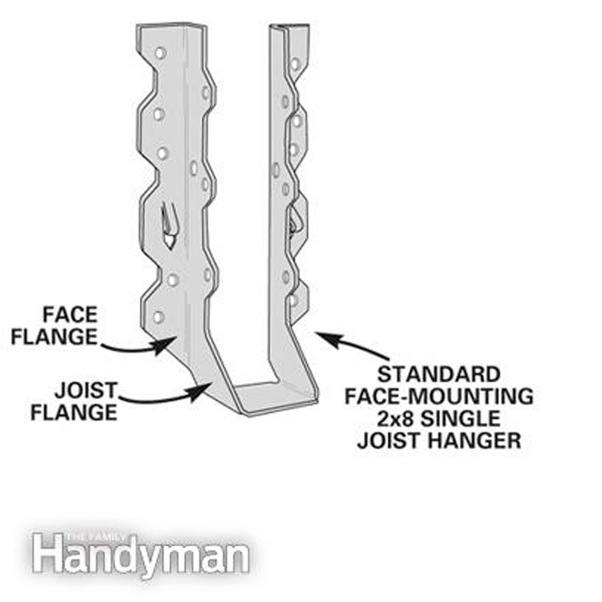 Joist hangers come in many sizes to support different dimensional sizes of lumber and I-joists. The beam hangers you’ll find at home centers typically have a galvanized coating and will work indoors and out. Most homeowners will use the common face-mounting type (Fig. A), but specialized hangers are available for unusual situations, such as building in a corrosive salt-air environment or joists that run at an angle.