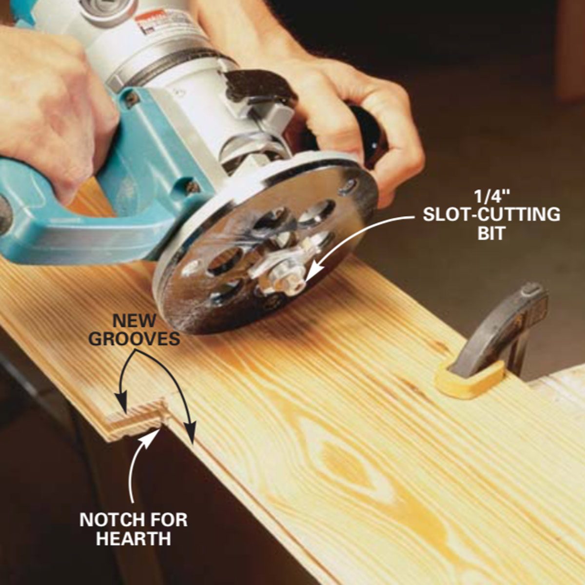 Rout a groove into the edge of this notched board with a slotcutting bit. The groove must line up with the hearth board’s tongue. Clamp the board securely to the horses or a workbench.