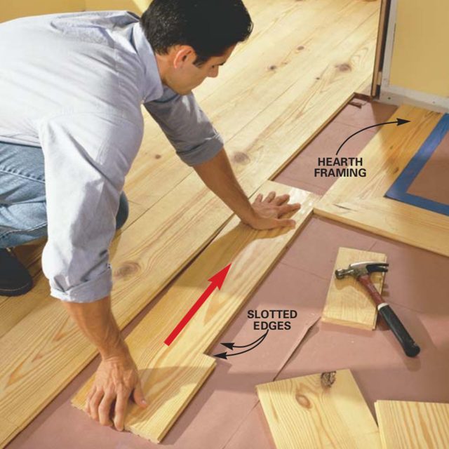 Later you’ll nail each board end into the joist with the decorative cut nails. Be sure to stagger butt joints from row to row so they don’t line up across the floor. Cut the boards to length with a circular saw but keep in mind that perfect cuts aren’t necessary; the ends at walls will be covered by the baseboard and it’s OK if the butt joints show small gaps. If you want to speed up the job, rent a sliding miter saw, especially for the angle cuts around the hearth.