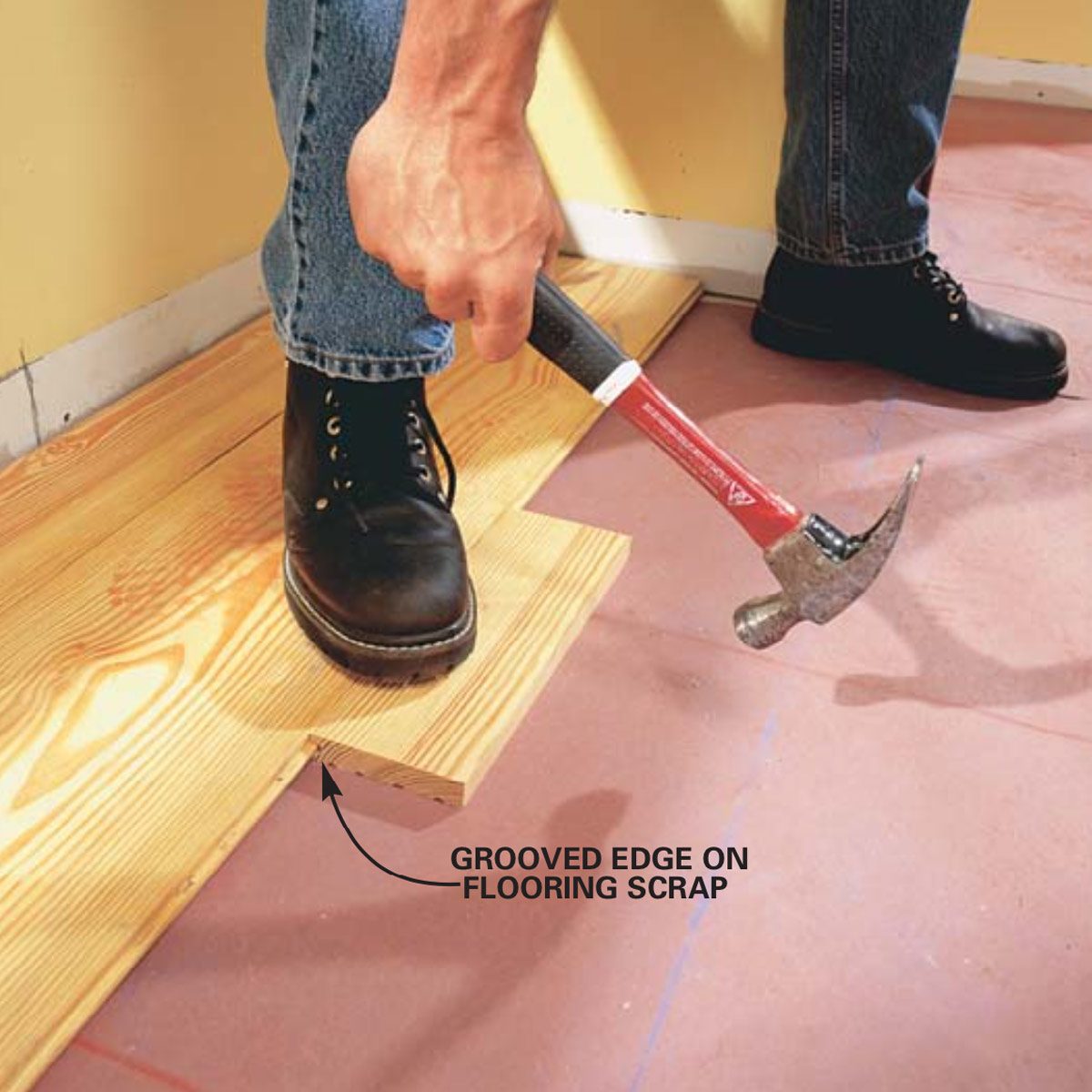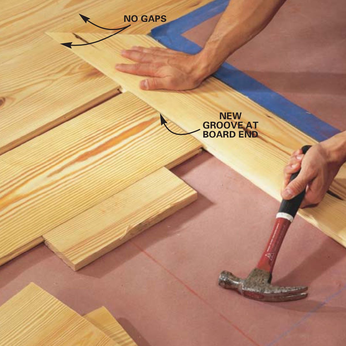 Fit the second board’s groove onto the tongue of the first. Tap with a block (flooring scrap) and hammer to drive the boards together. For an antique look, create a small gap (1/16 in.) between the boards with a removable shim.