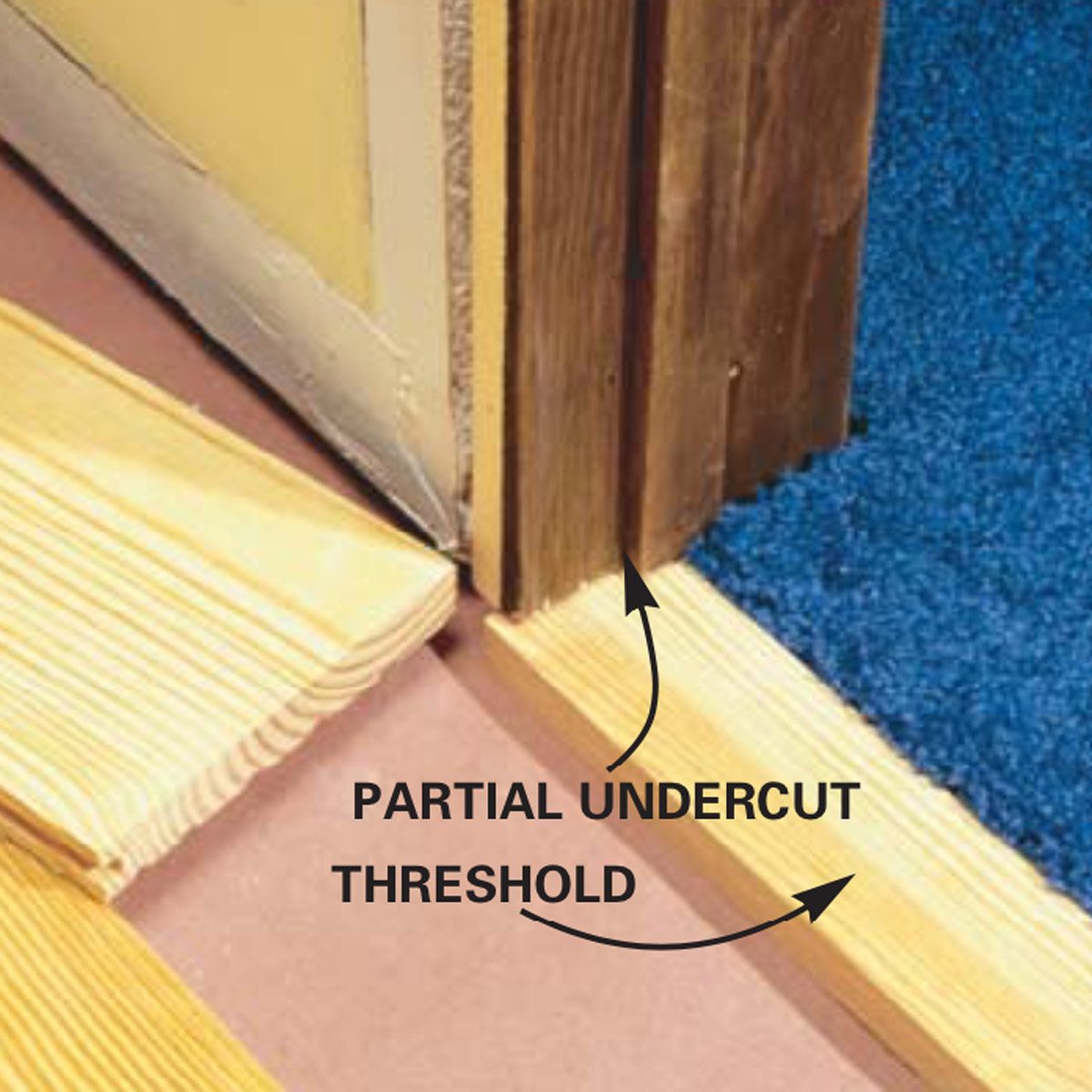 Transfer the cutout lines to the back of the board and cut out the notch with a jigsaw. Cutting from the back minimizes splintering of the front face. Mark and then cut the board to fit at the door jamb. Cut the notch so that it slides about 1/2 in. under the jamb so the jamb will appear to be completely sitting on the flooring.