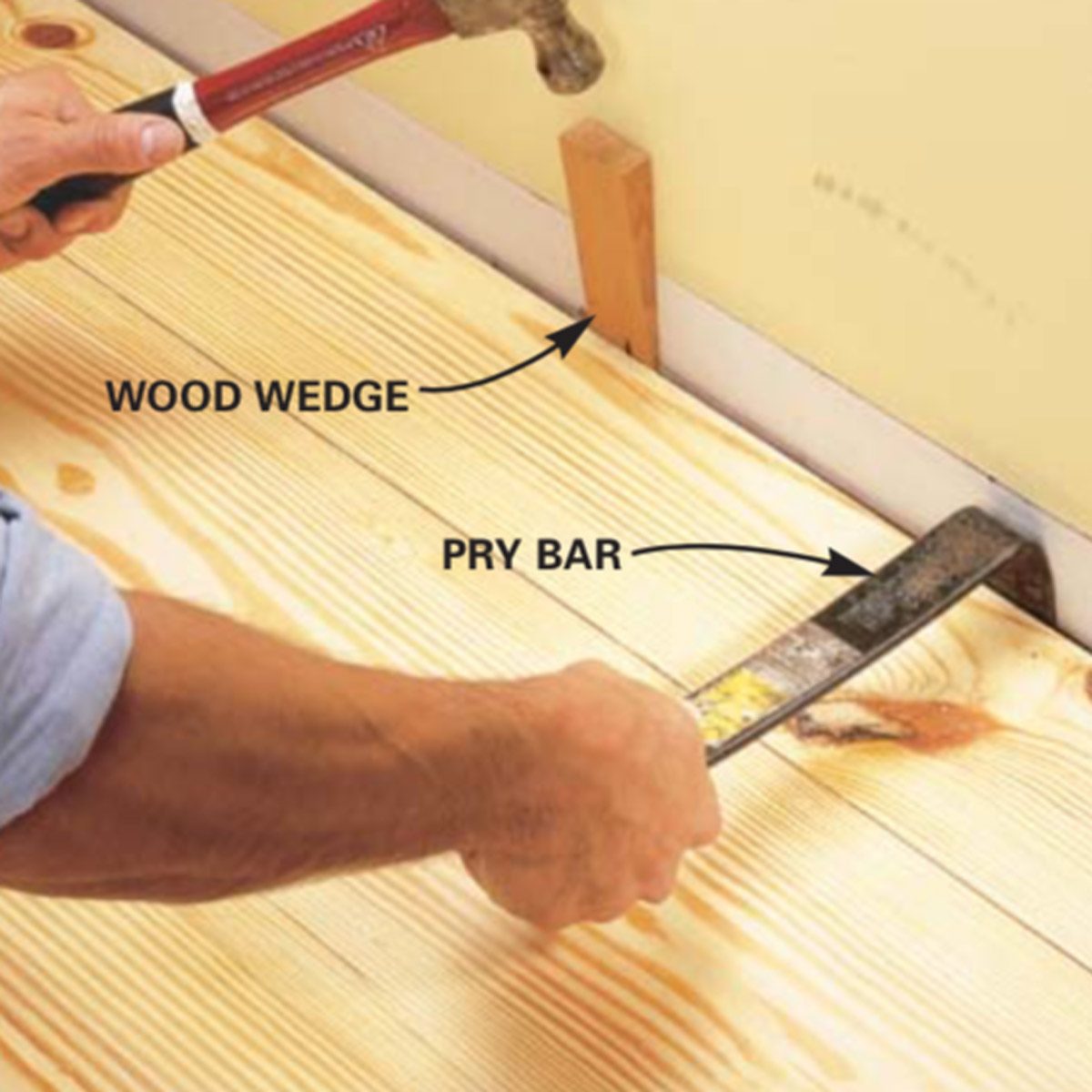Carefully pry the baseboard and door trim from the wall and set it aside. Then remove the floor covering and underlayment (if you have any) to get to the subfloor. Underlayment is a layer of plywood or particleboard often found under carpet or vinyl. Now is the time to do repair work on the subfloor. Remove the existing floor covering and pry up the underlayment with a pry bar, leaving the subfloor intact. Pull all protruding nails. Walk the floor to check for loose or squeaky spots in the subfloor. To tighten the subfloor, drive 2-in. screws into the joists.