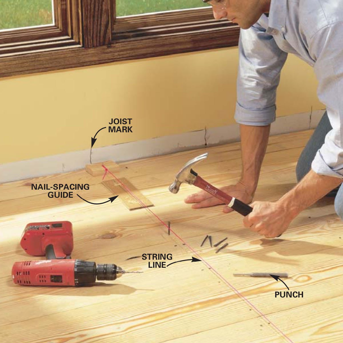 Stretch a string line (not a chalk line) to mark the joists. Drill the pilot holes for the cut nails using a simple spacing guide. Hammer the cut nails flush with the pine flooring and countersink 1/8 in. below the surface with a heavy punch or countersink. A traditional plank floor was face-nailed with handmade nails. A 2-1/2-in. masonry cut nail has this look. Mark each joist location with a string line (no chalk!) and drill pilot holes for the cut nails. The hole size should be close to the narrow dimension of the rectangular head of the cut nail. Make a simple guide to space the nails about 1-3/4 in. from the board edge (Photo 18). Two nails are sufficient to hold the 10-in. (9-in. actual) board flat, but a wider board will require three nails. Be sure to set the cut nails 1/8 in. below the surface before starting the finishing steps. When nailing the ends of boards, splitting is a real possibility even with pre-drilling. Don’t worry; minor splitting adds to the antique look.