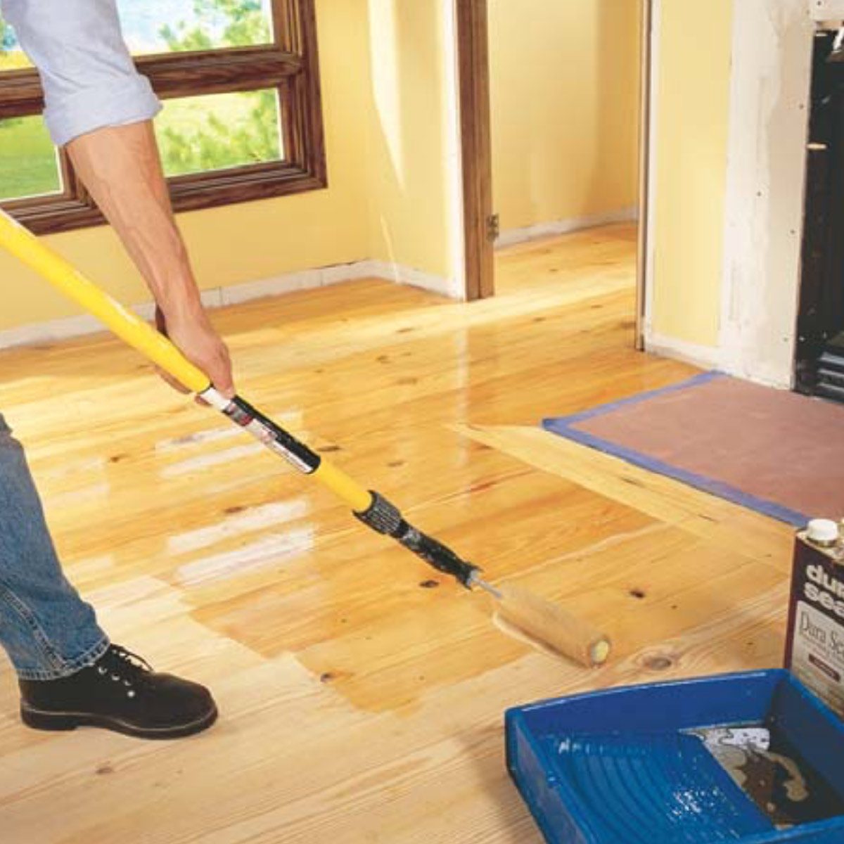 Pine is soft and must be sanded carefully to avoid gouges. The square buff sander worked well because it’s less aggressive than drum sanders. Even a novice can use it with confidence. First sand high spots and rough areas with a portable belt sander (40-grit belt). Then proceed with the square buff sander using the 60-, 80- and 100-grit papers or screens in sequence. Be sure to vacuum between each grit size. You’ll have to do a little hand-sanding at the edges and doorways. Also use the square buff sander with a 150-grit screen between coats of oil or varnish.
