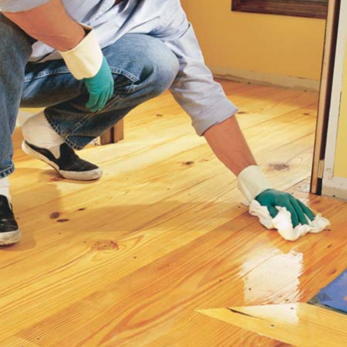 Wipe until dry; there should be no oil sitting on the surface. Our flooring material required only fine sanding. If you’re not sanding, clean the floor with a cloth dampened with paint thinner. Remove tough dirt or scuff marks with a fine (120-grit) sandpaper. Fill all your countersunk face-nail holes (not the decorative cut nails) with a hardening putty and sand flush with the wood with 120-grit paper. Use putty that closely matches the wood’s color.