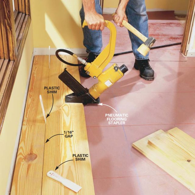 Insert shims for even gaps, and nail through the tongue of the board with a flooring stapler. Start at one end of the board and work to the other, nailing every 2 ft. After the first row, tap each subsequent row into place and nail with a flooring stapler. Nail every 2 ft. to tack the flooring in place—the decorative cut nails will hold it tight. We chose to create a small (1/16-in.) gap between boards by inserting plastic putty knives before nailing. The gap ensures that each board appears separate and adds to the antique look. Nailing a pine floor is much more forgiving than other flooring, because gaps are part of the look!