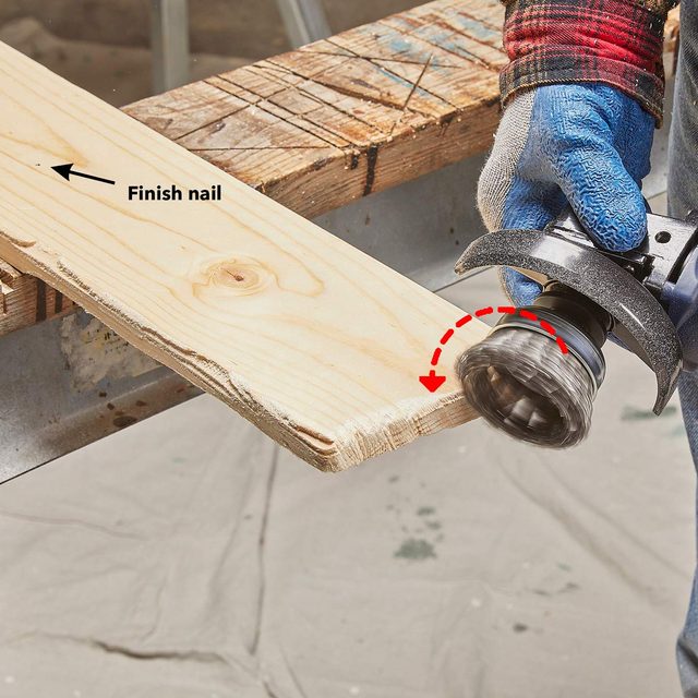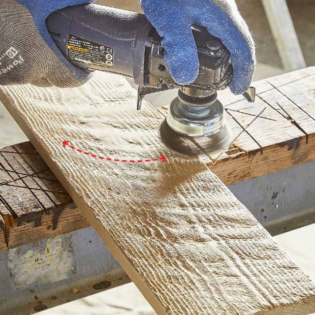 • Sweep the grinder across the board in a series of arcs to create the look of old, rough-sawn lumber.