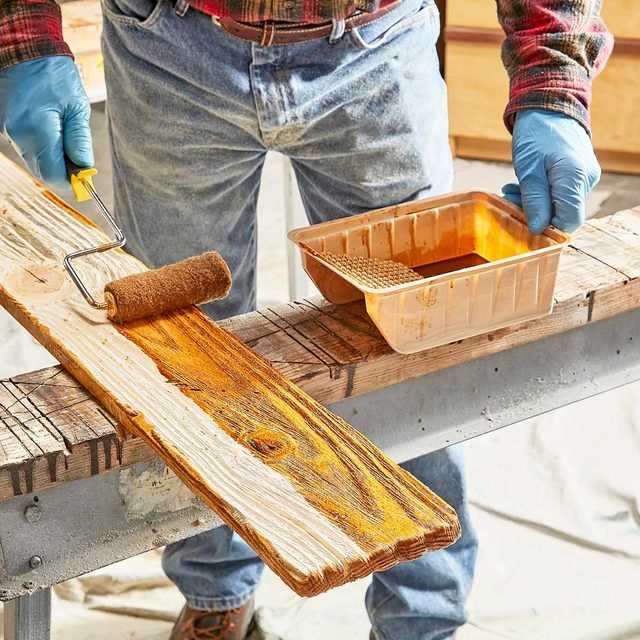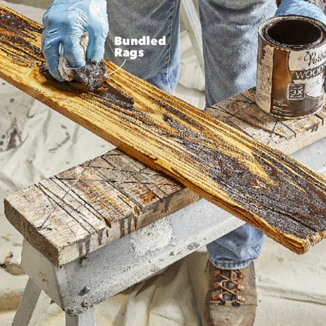 When you’ve completed the distressing steps for all of the boards, follow the wood staining process shown in the photos below. Don’t worry if the finish looks a little different from one board to the next. Variation will add to the authentic look. When you’re done with the stain rags, hang them over the edge of a bucket or garbage can to dry before disposing of them. Wadded-up, stain-soaked rags can spontaneously combust. Your boards will look most authentic without a clear coating, but if you need a more durable finish, let the stained boards dry overnight before brushing on a coat or two of polyurethane. Choose a flat or matte sheen to retain the weathered look.